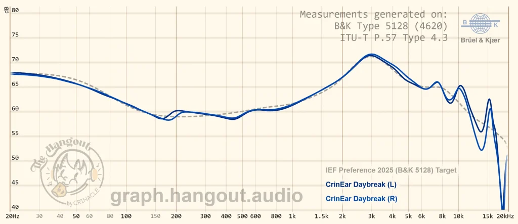 While the driver configuration on the Meta was kept hush-hush, the Daybreak openly sports one dynamic driver (DD) for sub-bass, two balanced armatures (BAs) for mids, and two micro-planar tweeters for treble extension. Tuning is based on the IEF Preference 2025 target, Crinacle’s own refinement of the Population-Averaged Diffuse Field target, and was done using a Brüel & Kjær Type 5128 ear simulator, a lab-grade measurement rig that costs well over 20,000USD.