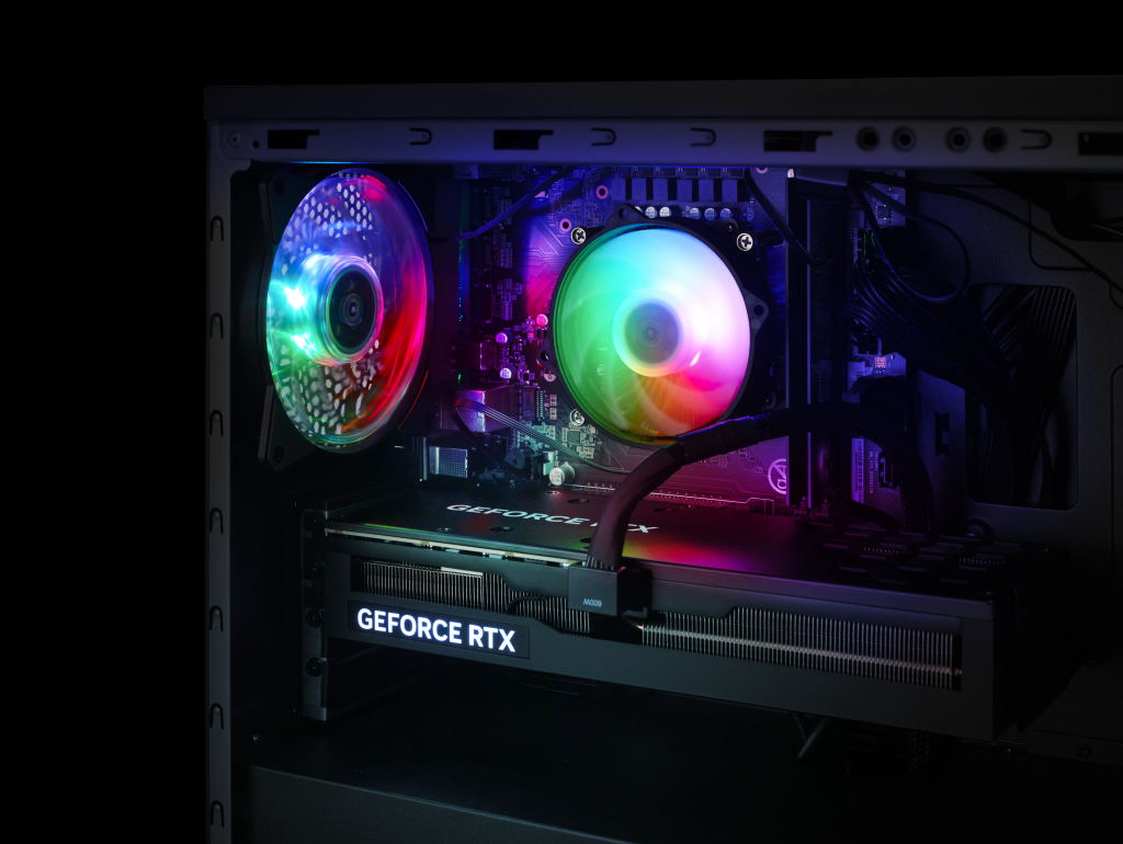 The case itself is EMI-compliant and features tempered glass side panels with mesh sections to improve airflow. It comes equipped with 120 mm RGB system fans at the front and rear, which help cool the system while adding a bit of flair.