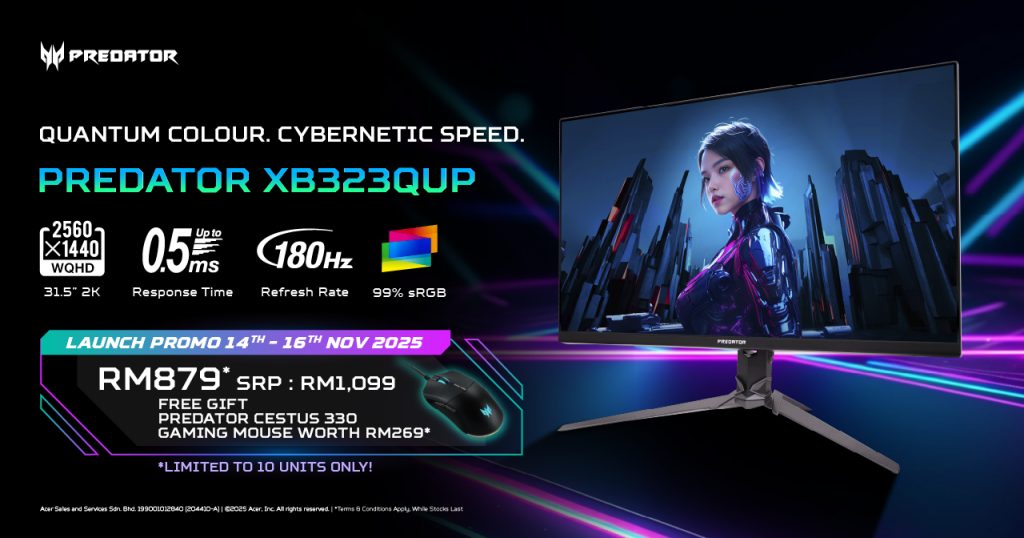 The Predator XB323QUP gaming monitor is also available now at RM1,099. The first 10 units purchased before 16 November 2025 will go for RM879, and come with a complimentary Predator Cestus 330 Gaming Mouse worth RM269.
