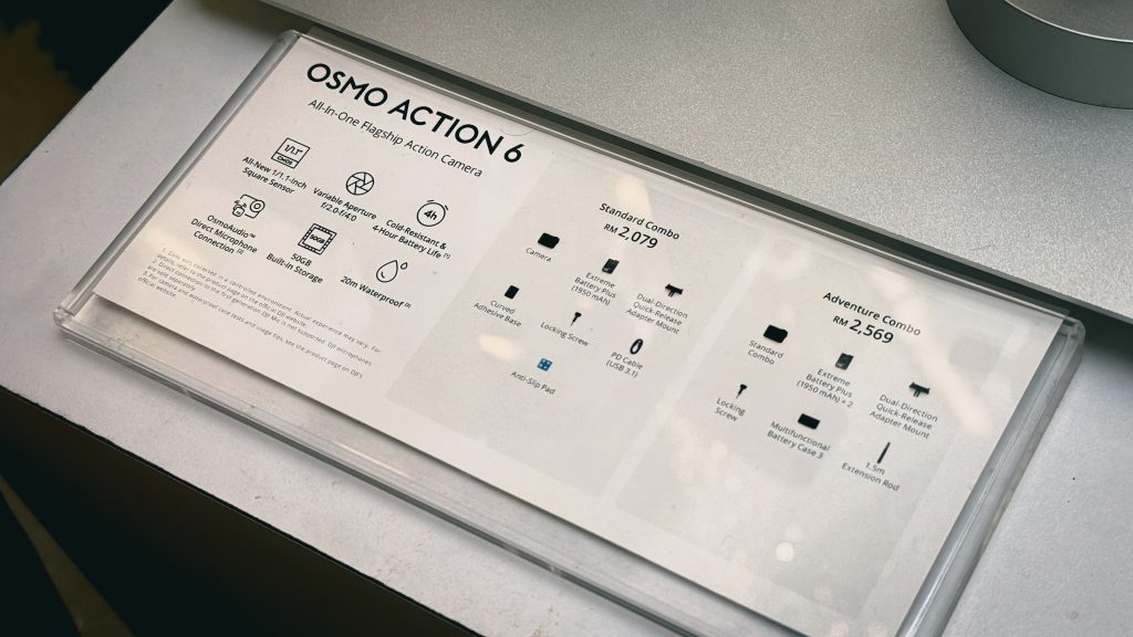 The DJI Osmo Action 6 is priced at RM2,079 for the Standard Combo, while the Adventure Combo goes for RM2,569 and includes two extra batteries, an additional mount, a battery case, and a 1.5 meter extension rod.